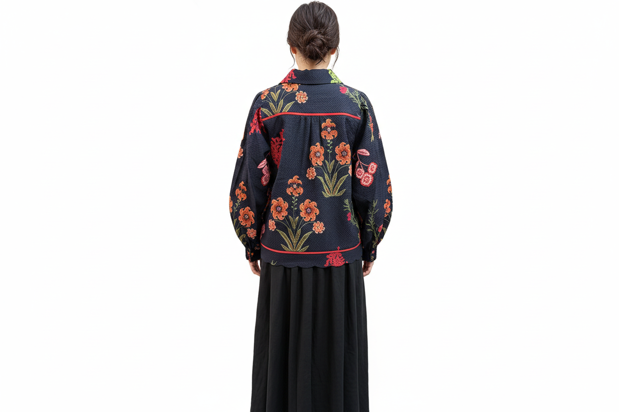 - Beautiful vibrant floral embroidery in orange, red, pink, and lime green