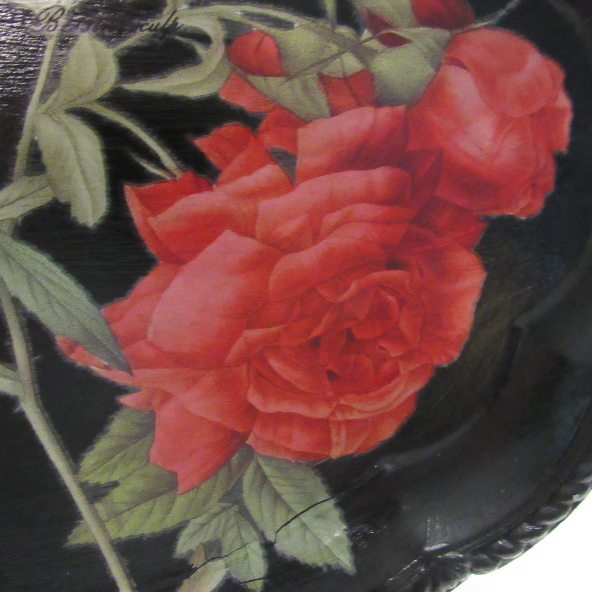 Hand-painted red roses and botanical designs on a rich black background