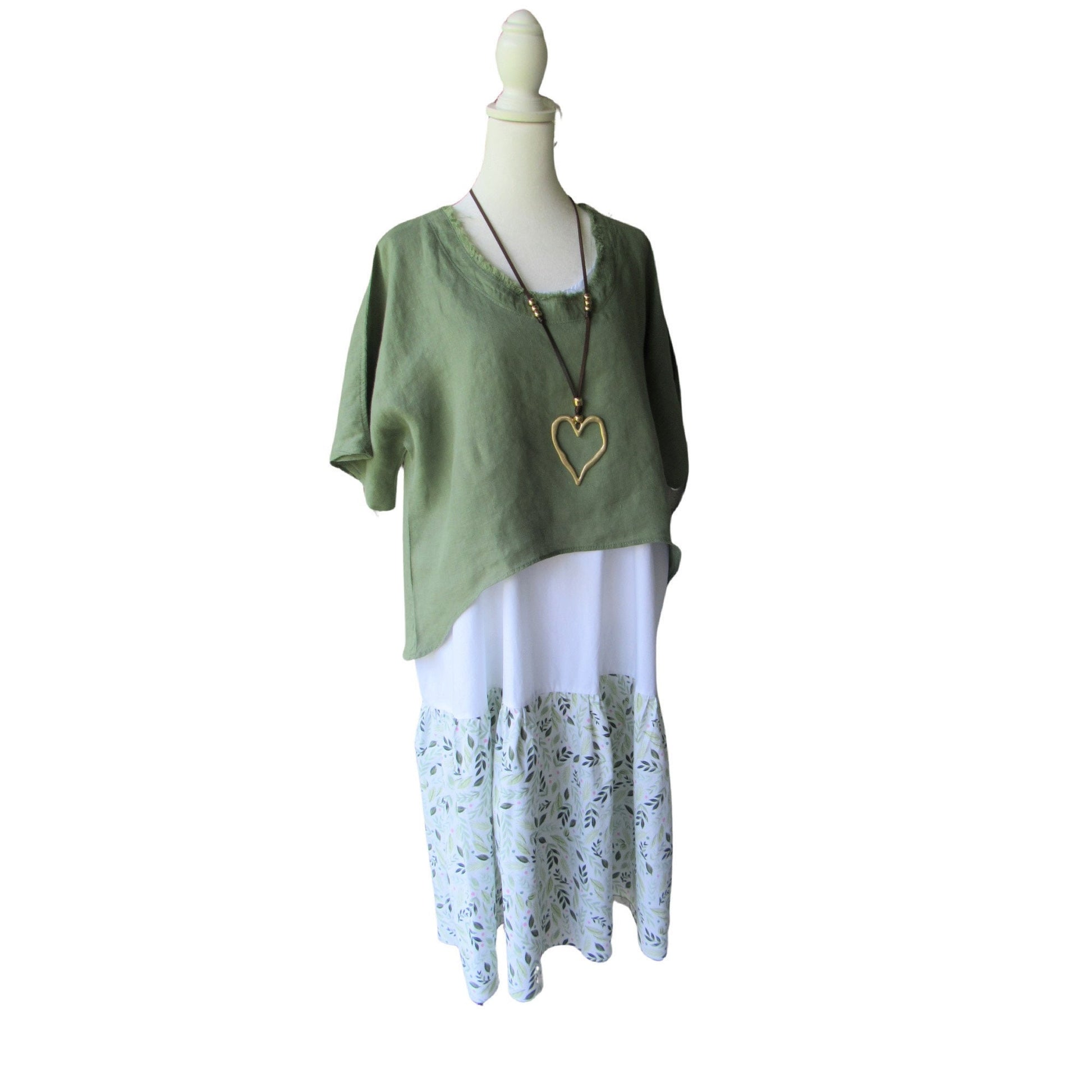 Green Linen Hi-Low Topper - Frayed Neckline, Lightweight Layering