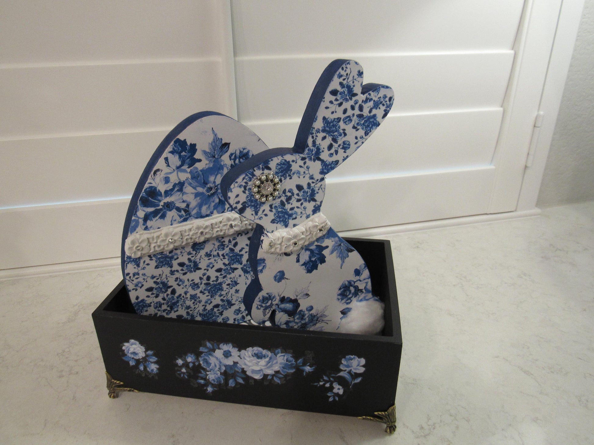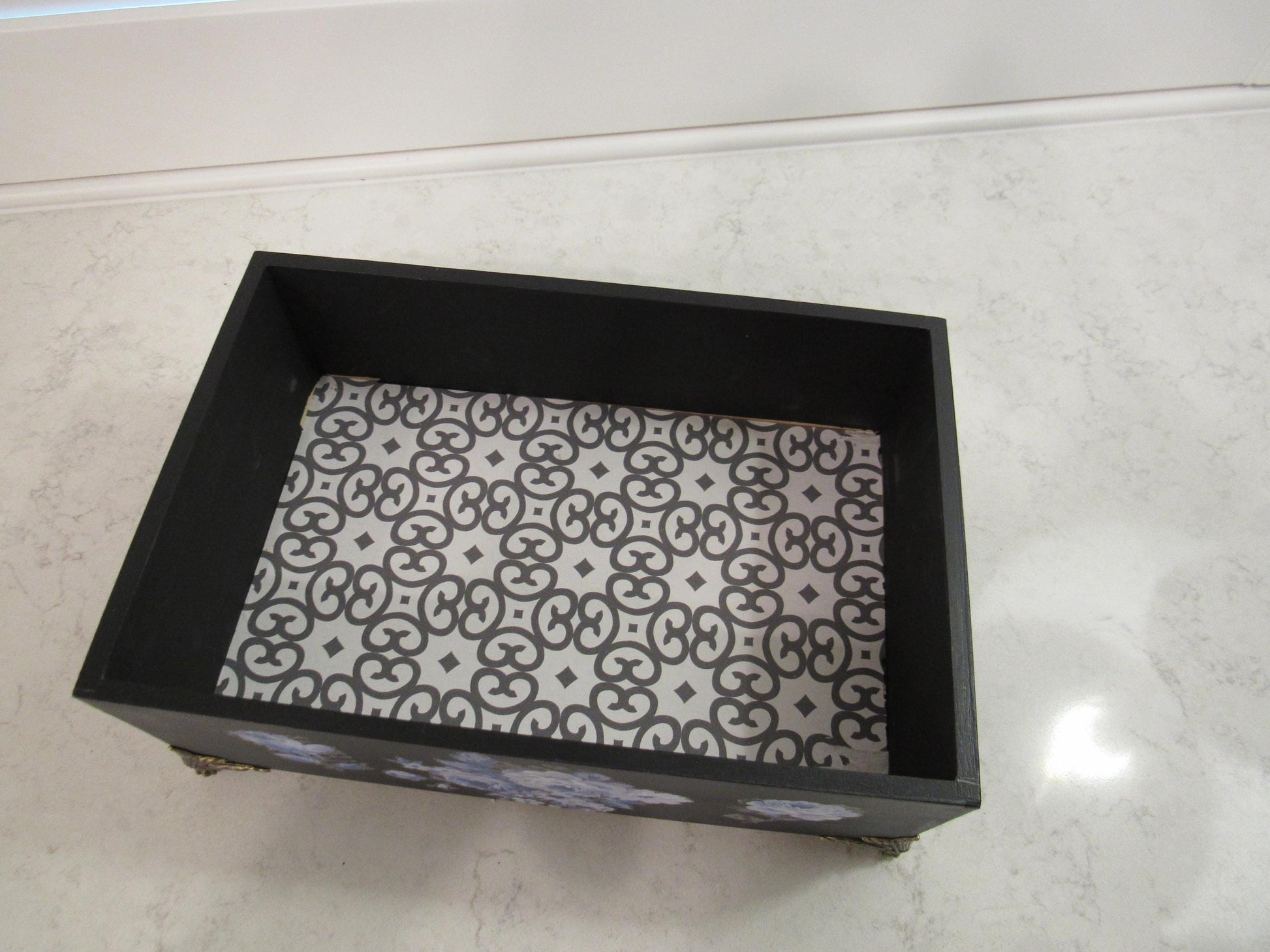 Add a touch of elegance to your home with this exquisite hand-painted bamboo storage box. Featuring a sophisticated matte black finish adorned with delicate blue and white floral roses, this one-of-a-kind piece combines artistry with functionality. The decorative patterned interior and ornate brass feet elevate this box from simple storage to a stunning decorative accent.