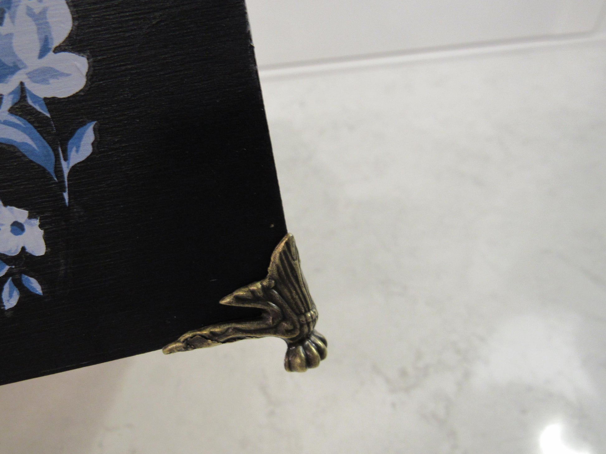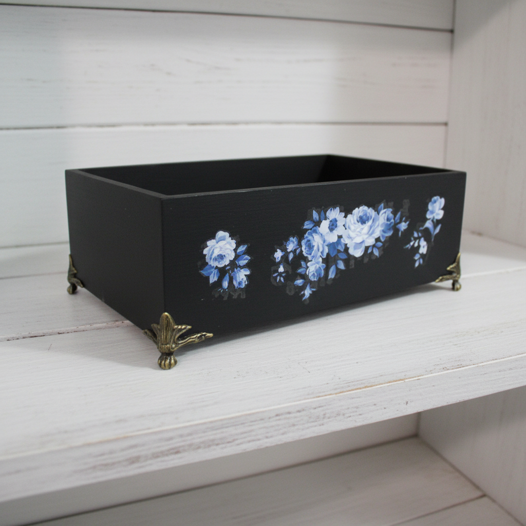 Hand-Painted Bamboo Storage Box with Blue Florals - Black with Brass Feet