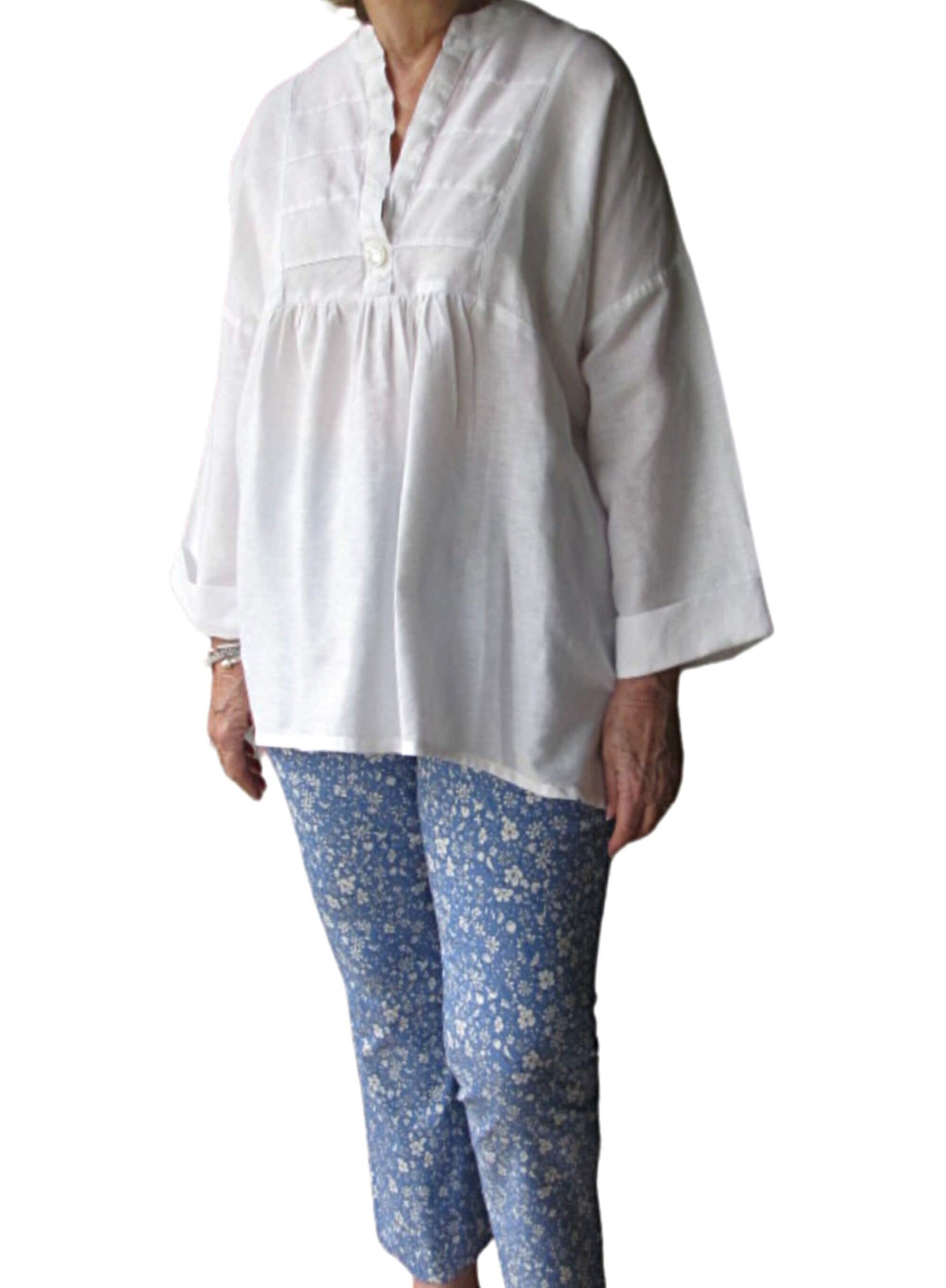 Final Sale Ready to ship in colors shown. Ladies 3/4 sleeve one size long top with tucked neckline and roll up sleeves. This tunic is a loose fit and easily fits up to Size 16 (see measurements below). The Tori top is made in 100% washable light weight linen that will last for years and years! Looks terrific with jeans, linen pants or our cute bloomers shown ~ sold separately. Arms and sleeves are perfect for most body types. Handmade in Texas by professional seamstress. Other colors may be ordered, contact me for details. One Size: Bust = 46" Length = 28" (front) 32" (back)